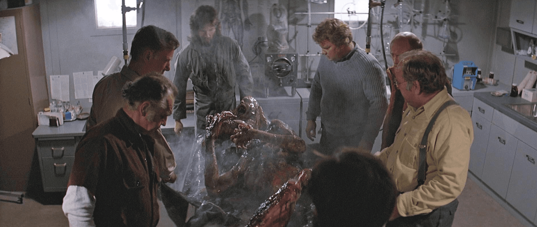 <기묘한 이야기>의 보금자리, 마이크의 지하실을 지키는 <괴물>의 포스터. 시리즈에 가장 먼저 등장한 이 영화는 <기묘한 이야기> 정체성, 그 자체입니다. 평화로운 작은 마을 사람들의 정신을 빼앗아 침입하는 ‘마인드 플레이어’를 암시하는 복선이자, 데모고르곤을 특수효과로 만드는 데 지대한 영향을 끼친 작품이죠. 더퍼 형제가 찬사와 존경을 바치는 최애 영화이기도 합니다. 괴물의 머리가 녹아내리는 악명 높은 장면을 보며 데이트하는 클락 선생님과 남들 다 싫다는 ‘뉴 코크’를 이 영화에 빗대어 “더 달콤하고, 더 강렬하고, 더 훌륭하다”는 루카스는 세계 최강 비위의 소유자!