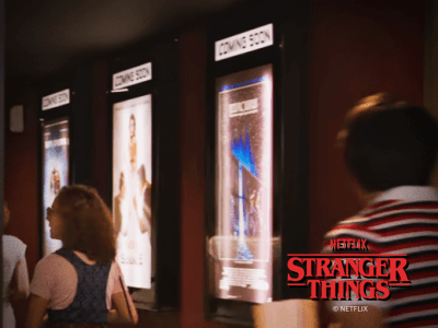 You can see the poster for <Explorers> as a coming soon title at the Starcourt Mall multiplex theater. A movie the kids of <Stranger Things> would definitely love! Boys building a spaceship in their backyard? Meeting teenage aliens?