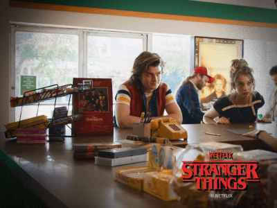 A small promotional display for <The Outsiders> stands on the table where Robin interviews at Family Video. Phew, it would have been a shame if this film—featuring the most dazzling young actors of the 1980s—didn't appear. The conflict between Hawkins High's jocks and the Hellfire Club misfits brings <The Outsiders> to mind.