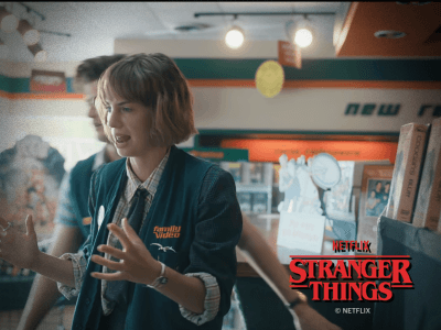 The title of Clint Eastwood's <Coogan's Bluff> is clearly visible on the Family Video classics shelf. The role model for Chief Hopper's undaunted wit and guts while captive in the Soviet labor camp is definitely the tough cowboy Clint Eastwood. Season 4, Episode 9—Yuri working on his beat-up plane, glancing at the stone-faced Hopper: "More Clint Eastwood." Ring a bell?