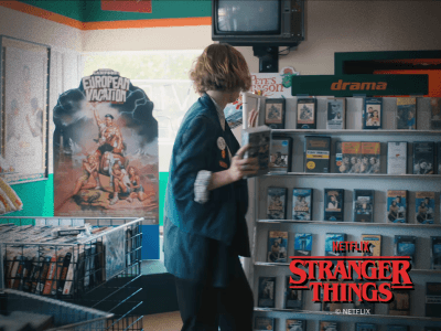 Released in August 1985, <Weird Science> can be encountered as an upcoming feature at the Starcourt Mall theater and as a large poster at the Family Video store. A teen sci-fi fantasy film by Dustin's favorite director John Hughes, about kids who create the woman of their dreams. Could the reason Dustin's friends didn't believe his girlfriend Suzie existed be because they watched this film?