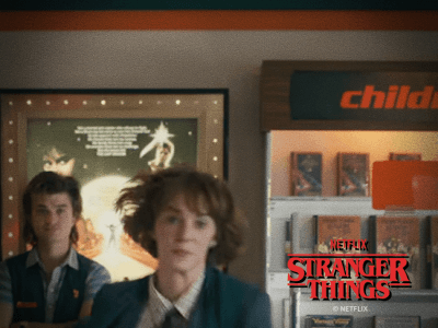 The presence of <Citizen Kane> is unmistakable in the Family Video classics section. It seems the <Stranger Things> props team couldn't leave out <Citizen Kane>, considered one of the most 'great' films in cinema history. While we're at it—let's scan Family Video's classics section. Next to <Citizen Kane>—what looks like <Casablanca>, and Charlton Heston's epic wilderness adventure <Call of the Wild> from 1971. One shelf down—John Huston's 1941 <The Maltese Falcon>. Right beside it—Alfred Hitchcock's 1959 <North by Northwest>. Keith the manager—Hitchcock fan?