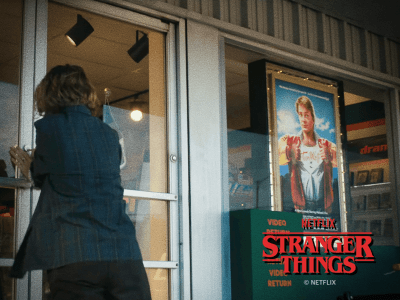 Michael J. Fox of <Back to the Future>, looking somewhere between Superman and a werewolf, decorates the Family Video store. A comedy about an ordinary high schooler who discovers the secret of his werewolf family and transforms into a basketball star: <Teen Wolf>. Fits the 1985 setting perfectly—and ties right into Season 4's "basketball star" Lucas arc. A boy who finds himself through sports—then loses himself trying to fit the mold.